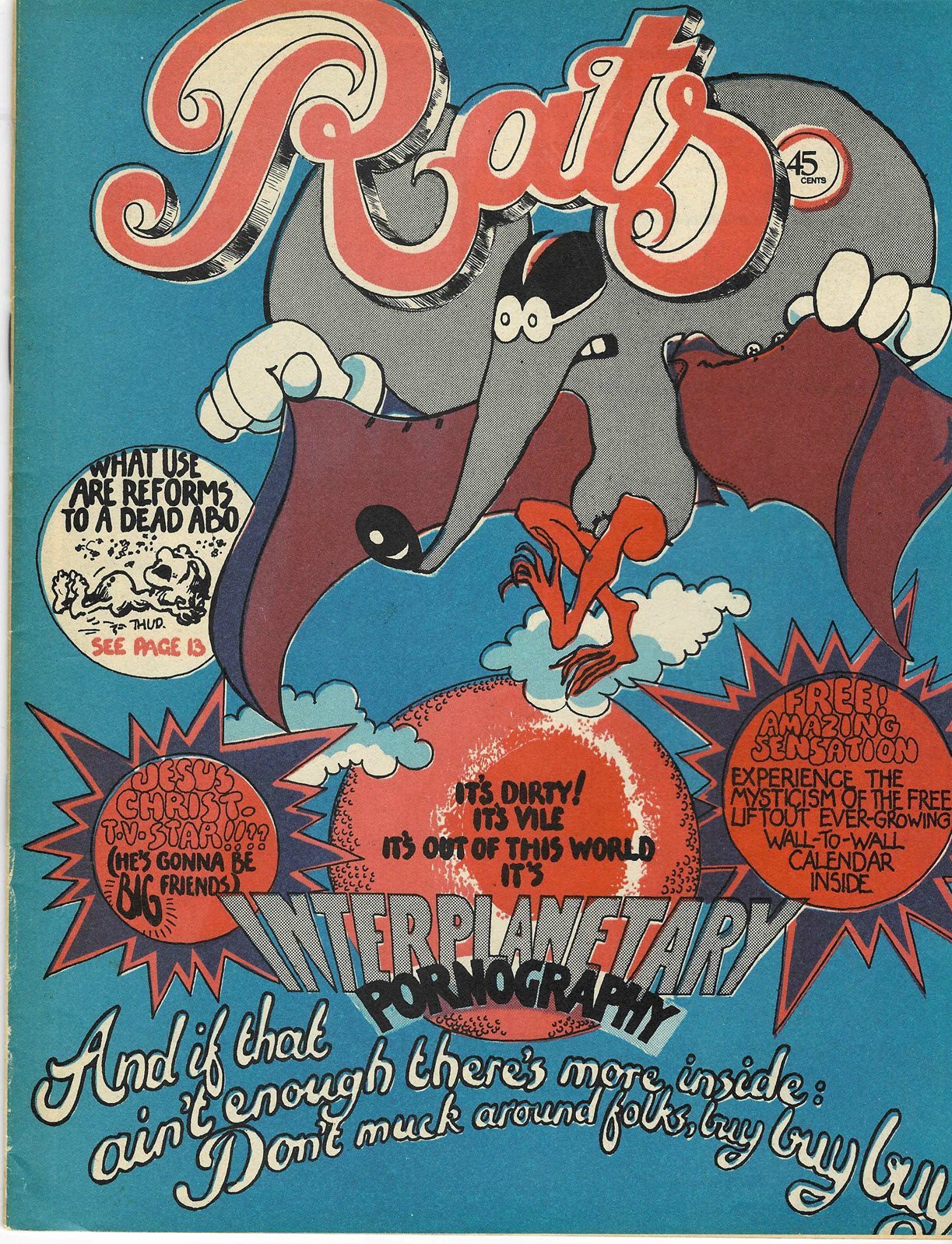 A satire magazine, aimed at the counterculture of the early 1970s. Contains text artists, illustrations and comic strips.